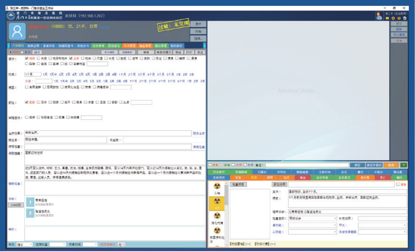 門診電子病歷系統(tǒng)采用一體化設(shè)計,從刷卡、掛號到寫病歷、開醫(yī)囑都在一套系統(tǒng)中完成,門診病歷具有初診、復診和續(xù)診模式,支持CA電子簽名和時間戳,提交后生成具有可靠電子簽名的病歷文檔,滿足無紙化需要。